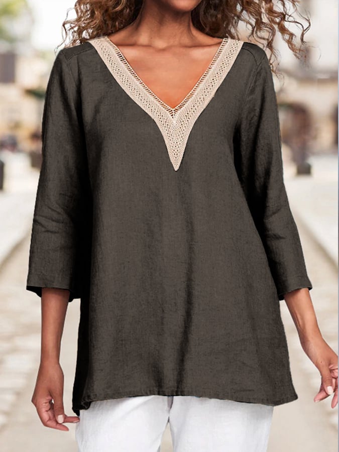 Women's Cotton Lace Hollow V-Neck Solid Color Casual Loose 3/4 Sleeve Shirt