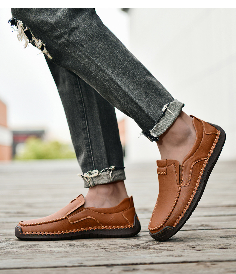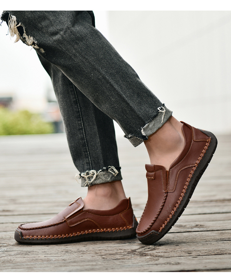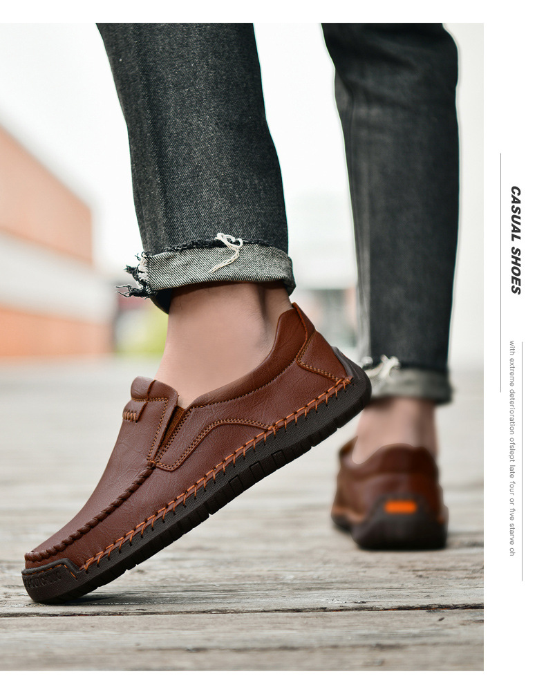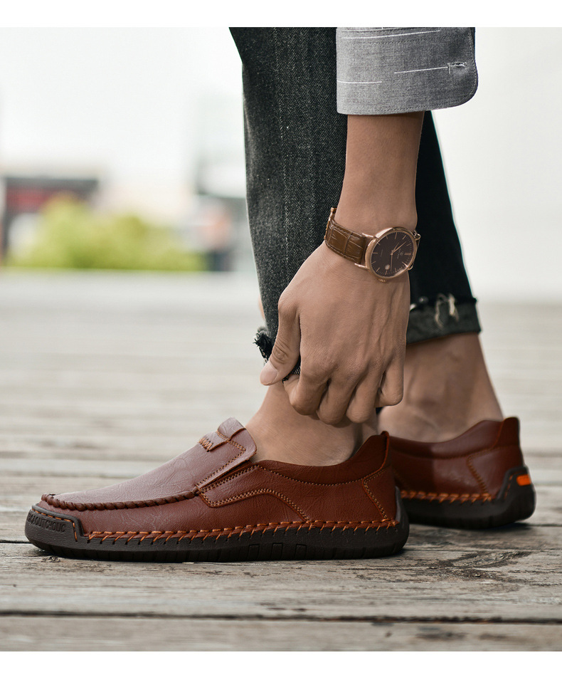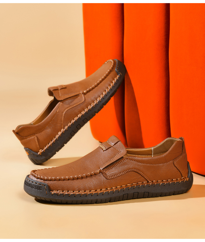 Men's Brown Genuine Leather Slip-On Loafers - Casual Comfort Shoes with Stitched Detailing