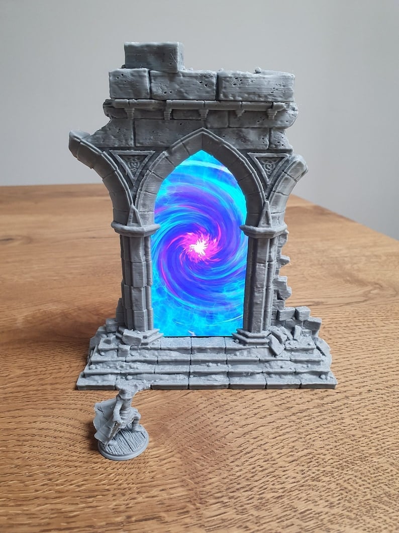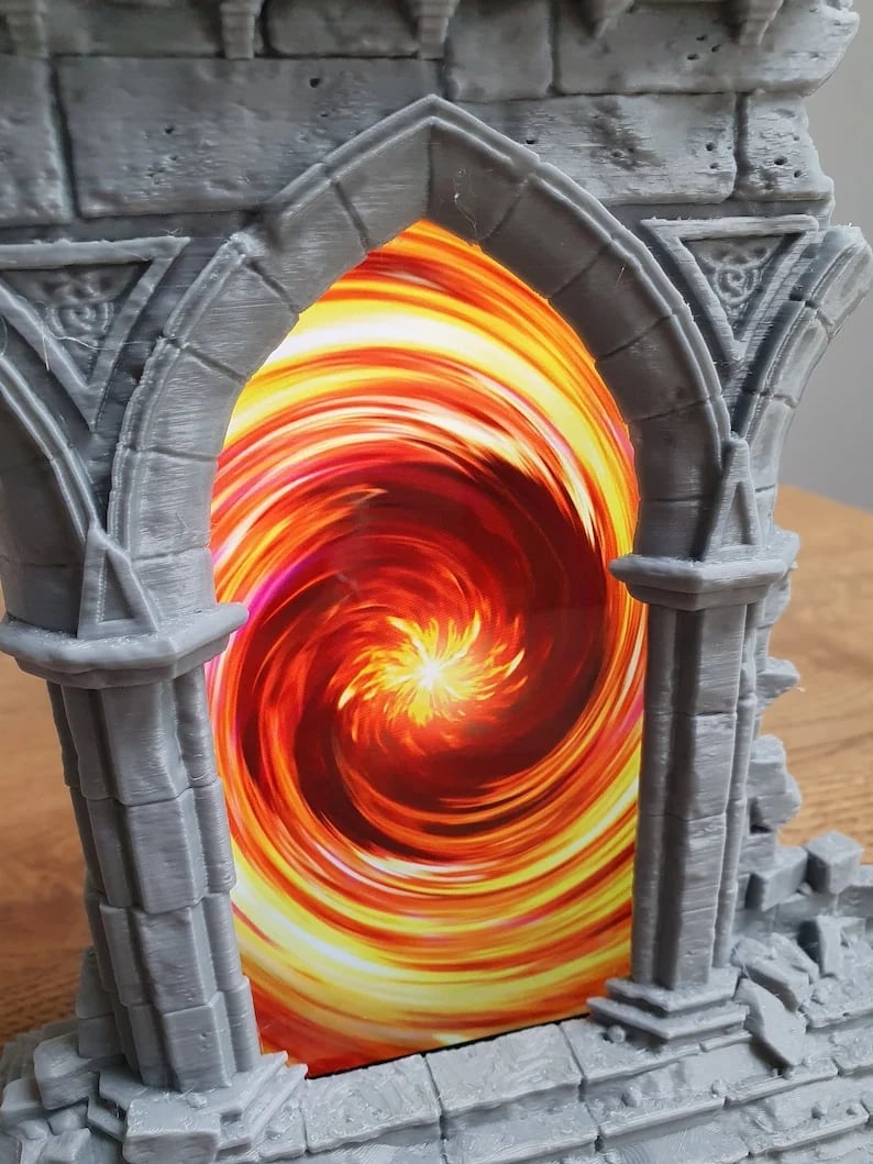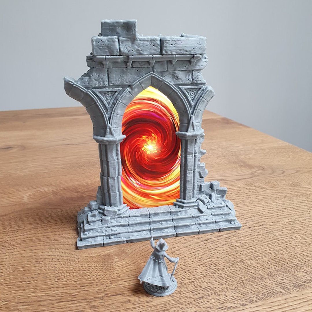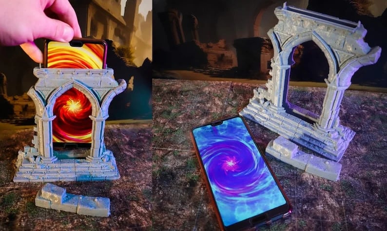 Step up your game with the "Calling Portals" Ruined archway terrain piece phone display for D&D and table top gaming.